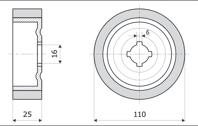 Die Rolle hat einen Blechkern und wird mit der weissen Gummimischung von 50±5 ShA gummiert. Der Gummi hat einen sehr guten Griff, hinterlässt keine Spuren und wird abriebfest.