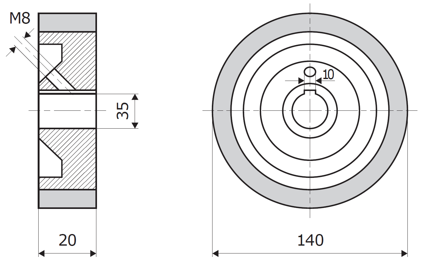 Die Rolle hat einen Stahlkern und wird mit der braunen Gummimischung von 70±5 ShA gummiert. Der Gummi hat einen sehr guten Griff, verliest keine Spuren und wird abriebfest.