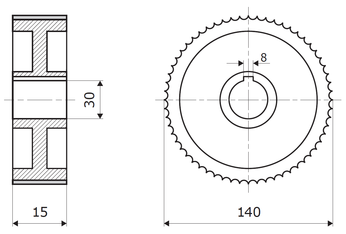 - das Zahnprofil (A, B, C, D, E, F, G, H, X – wenn Sie das Zahnprofil X auswählen, wählen Sie die Richtung der Verzahnung und das Material nicht, da es nur als verchromt zur Verfügung steht)