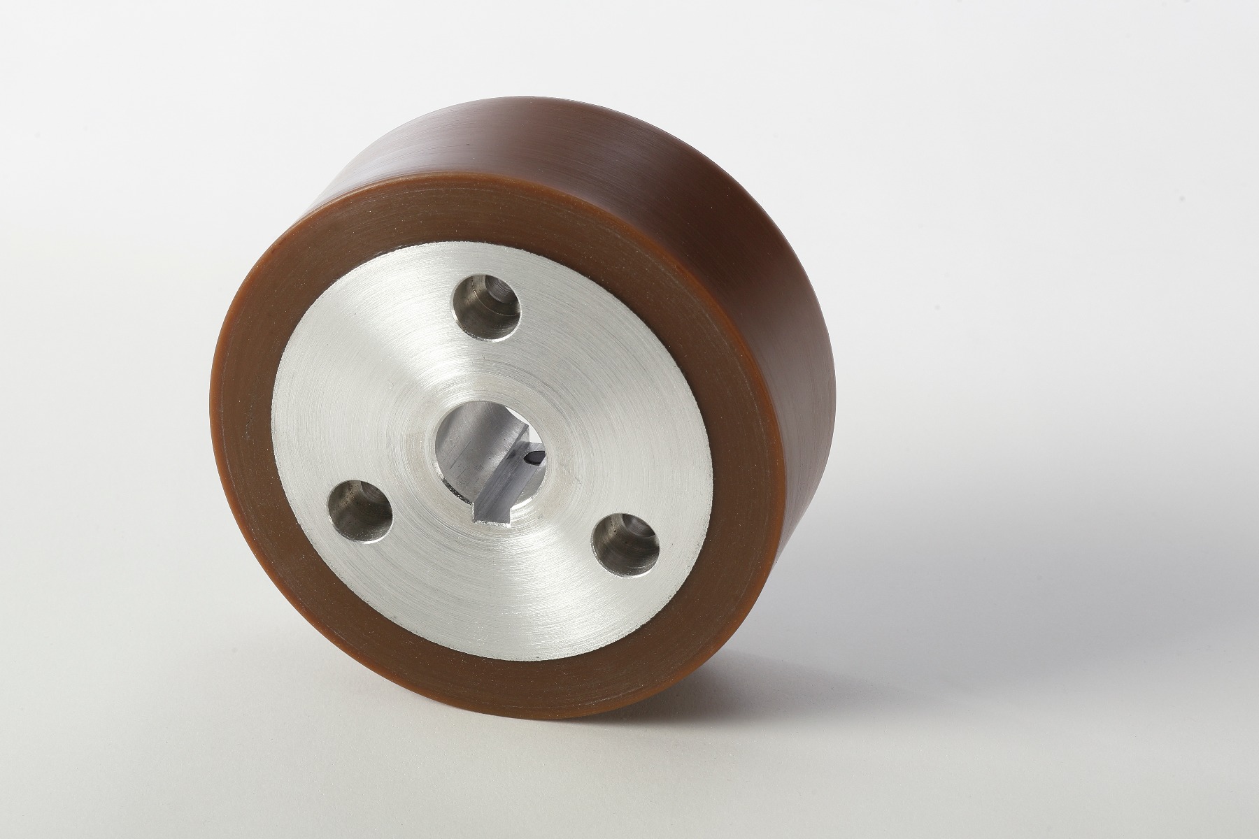 Podajalno kolo ima aluminijasto jedro, gumirano pa je s 70±5 ShA trdo, rjavo, gumijasto zmesjo, ki ima zelo dober oprijem in ne pušča sledi na lesu. Guma je prav tako zelo odporna na obrabo.
