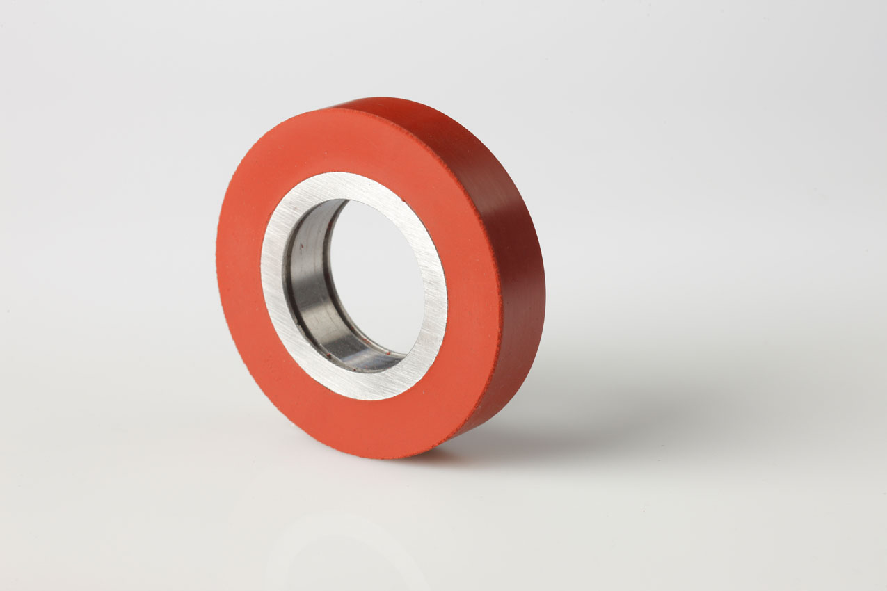 Kolut ima jekleno jedro z ležajnimi mesti (brez ležaja in varovalnega obroča), gumiran pa je z rdečim, mehkim silikonom, trdote 50±5 ShA, ki ima zelo dobro odpornost na višjo temperaturo (pri daljši izpostavljenosti do 200° C, pri krajši izpostavljenosti do 220° C). Koluti so primerni za montažo na različne robne lepilke.