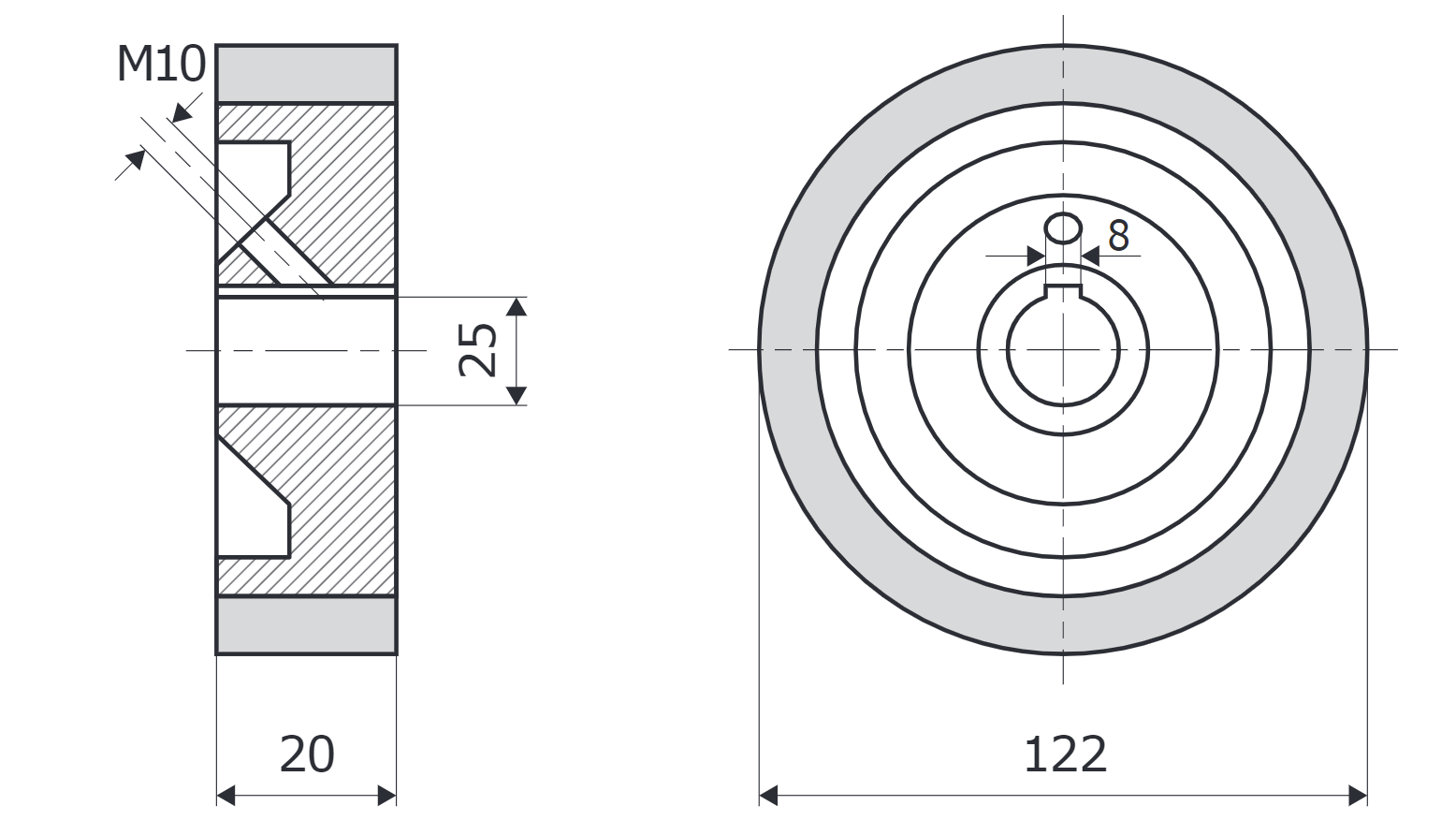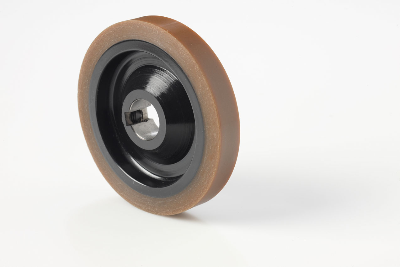 Kolut ima jekleno jedro, gumirano pa je s 70±5 ShA trdo, rjavo, gumijasto zmesjo, ki ima zelo dober oprijem in ne pušča sledi na lesu